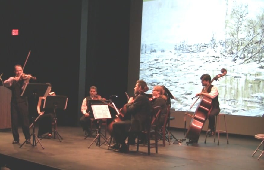 NCE Artistic Director Leo Sushansky was the soloist for the evening, and he was at his musically virtuosic and personal best serving as the soloist in this unique performance of Vivaldi’s Four Seasons. Sushansky is a Juilliard trained and highly accomplished violinist, one who is entirely at ease conversing with an audience. He also has an engaging personality and a wonderful sense of humor that makes all of his concerts a very enjoyable experience for audiences. This concert provided an opportunity for him to show off all of his talents. For each of the four seasons represented in Vivaldi’s masterpiece, before Kammerer recited the corresponding sonnet, and before the musical performance of each of the seasons, Sushansky explained and, along with the NCE ensemble, demonstrated how the words of the sonnets were expressed in Vivaldi’s music, while sharing that Vivaldi actually provided explanations of each passage in the form of personally scribed descriptions that he placed directly into the musical score.