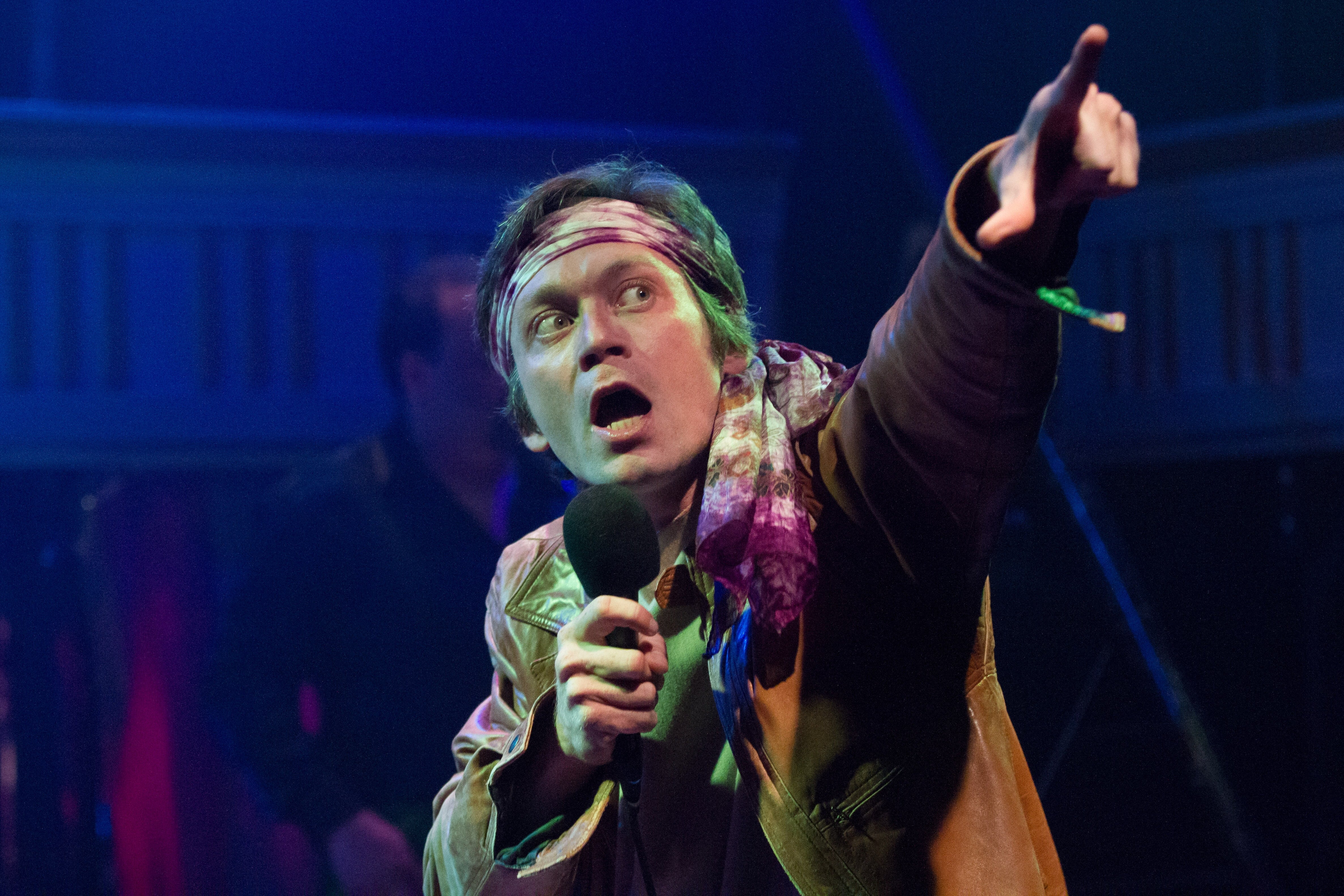 The production also has an uncertain relationship with its audience. At the top of the show, Chrysis asks the audience if anyone wants to join the band on stage to sing a song. Or does she? It’s too early in the piece to tell if the cast is actually expecting someone to take them up on the offer, and so we’re just left hanging. At “Nero’s” big amphitheatre performance the audience is led not once but twice in “making some noise” for the false emperor, neither of which actually leads into his appearance. It’s another false start and spectacular waste of audience trust good-will. Picking up the slack as Nero’s fans are ensemble members Ryan Alan Jones, Alani Kravitz, and Brian McDermott. These talented, energetic young actors do a great job of filling out the world of Nero/Pseudo, but they’re put in an awkward position as audience surrogates. Either trust the audience enough to fully bring them in to the experience or let the fourth wall stand and make the world feel fully cohesive. Doing both rarely pays off.