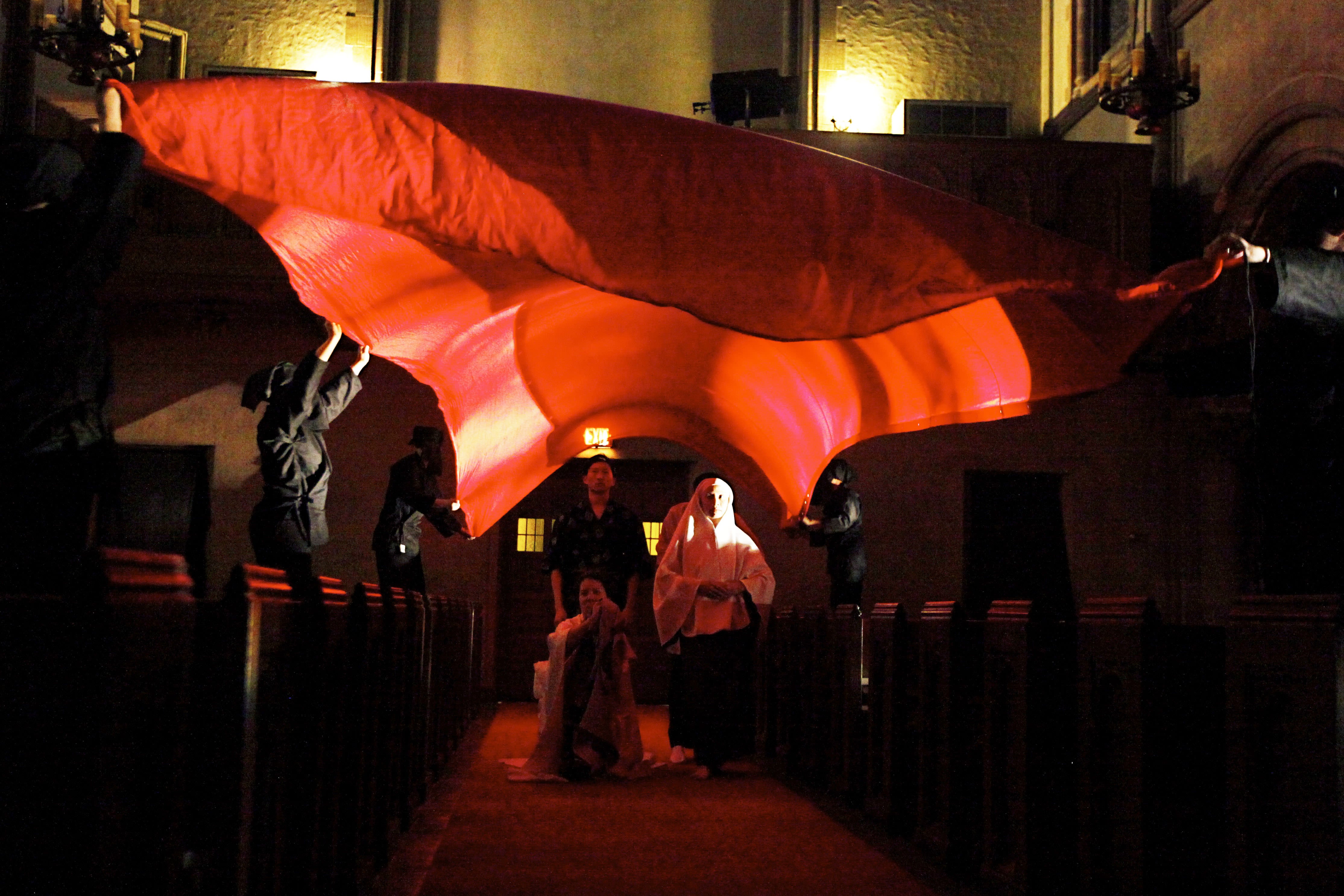 The Kwaidan experience begins as soon as audiences approach the church doors for entry where you are greeted by a Japanese woman in a traditional kimono who wraps on the door three times. A man dressed in black including a veiled black head covering peeps through a small door opening and announces “The portal will open shortly.” From that moment on, the limited audiences of thirty people at a time follow the actors through a ritual journey and the Kwaidan labyrinth of church spaces including hallways, stairwells, seemingly abandoned rooms, the basement, and even the main sanctuary. The walk of encountering characters and creatures is the contrasting, parallel worlds of East meeting West.