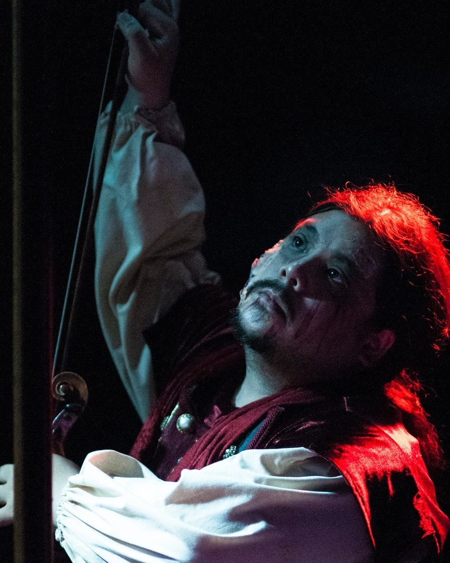 One of the central aspects of Poe’s original story is the notion that the house is “alive” with the spirits of the past, and this is translated quite literally in Pallas’ musical. The four “ghosts” of Ushers past (Laura Rocklyn, Hilary Morrow, Russell Silber, and Jon Jon Johnson) act as a sort of Greek chorus, omnisciently surveilling the family estate. They also occasionally act as human set pieces, holding up lanterns and such for the use of the living characters. In this way, the ghosts support both the design of the show, and the idea that the house of Usher is alive. Jon Jon Johnson pulls double duty as a violinist whose haunting strings greatly contribute to the sound of the show, and as the medieval ancestor Alabric Usher. Hilary Morrow, as Merowald Usher, is a consistently engaging and demonic presence that highlights how heavily the Usher ancestry weights on the current living members.