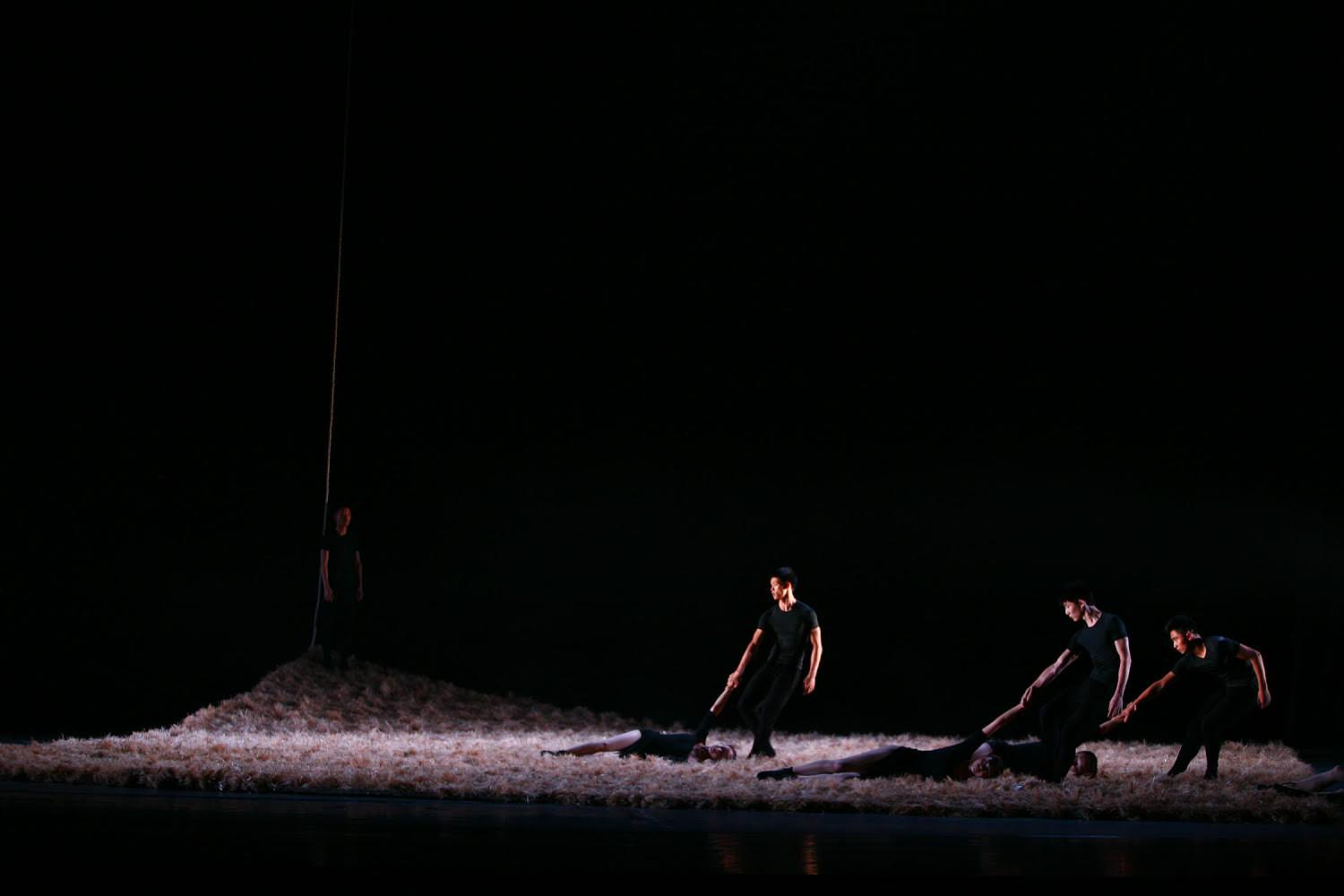 Each section of the dance uses a different set and floor surface, from the black earth beneath the backdrop of a full moon and snowy mountain peak to that aforementioned grassy slope. And there’s always one mysterious figure – a male who commands our attention. At first he is dressed in red and awakens to a circle of his admirers (or his adversaries?). Then we find him dragging the dancers, one by one, their bodies skimming the stage floor with grace and elegance. Finally he’s left alone dangling an endless rope from a high rafter, an ending that leaves us with more questions than answers.