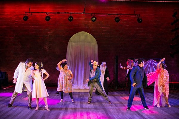 The set designed by François-Pierre Couture features a movable feast of floaty curtains and cloth panels for the hospital and desert scenes. Props on rolling casters become part of the dance macabre as the actors wheel them out with twirls and flourishes accented by additional rolling sounds provided by designer John Zalewski. Flashing lightening and cartoonish back-wall hues like magenta are designed by Pablo Santiago. A long wig for Fabiola Castillo by Anne Nesmith features overcooked tints and bouncy curls, while her costumes by Julie Weiss scream nouveaux riche. Even the exuberant crowd on opening night got into the style of it with a few gents wearing silk blazers emblazoned with pastel medallion prints.