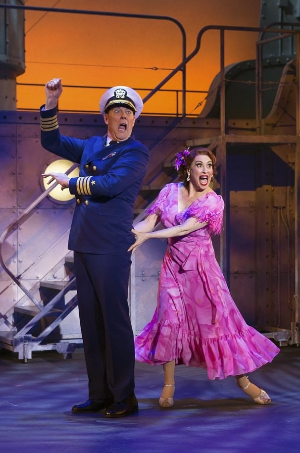 Mona Kent, the leading lady (played with demonic comical control by Lesli Margherita) conveniently falls ill just before the opening curtain, and guess who is called on to glance at the score and play the role? That’s right – it’s Ruby, who miraculously knows every one of Ms. Mona’s numbers as well as their accompanying movements. Ruby and her new friend Joan, plus the two sailor suitors, with the help of the ship’s captain (John Bolton, doubling after playing the director in the first act) perform everything from “Dames At Sea” to the star turn for Ruby, “Star Tar,” which leads to a triumphant triple wedding for everyone, and a tune for the occasion, “Let’s Have A Simple Wedding.” If all this information boggles your mind, do not fear. No one’s mind was expected to exercise when at a musical, and a good thing, too.