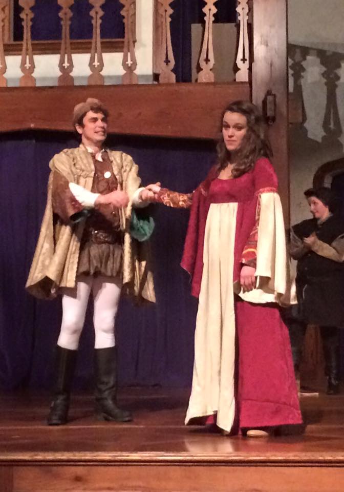 The story of The Taming of the Shrew is a familiar one. We have 2 sisters from a wealthy family, both beautiful and of marriageable age. Charming Bianca, played by Tegan Williams as appealingly demure, yet slyly sassy – is every suitor’s dream. The problem is that her dad, Baptista Minola – portrayed with amusing exasperation by Ben Fisler – insists that before sweet Bianca may be courted, his elder daughter, the much less agreeable Katherina (“Kate”), must first be wed. A group of clever husband-wannabes, each adeptly performed by the BSF cast, concoct a plan with their servants to secretly woo Bianca while their brave champion, Petruchio, sets to win the hand… and substantial dowry… of acid-tongued Kate.