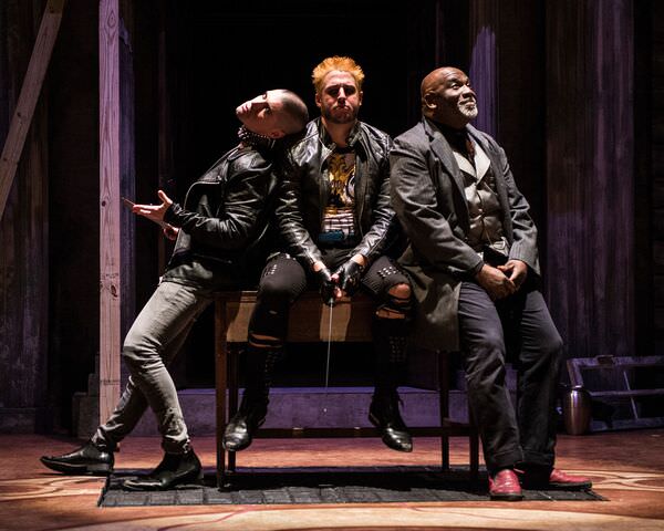 Karin Rosnizeck and Gregory Burgess, were electric as Tamora and Aaron, respectively. From the first time we see her pleading for her son’s life while chained to a whipping post, Ms. Rosnizeck made this Tamora’s court. She wasn’t so much chosen by Saturninus to be Empress as destined for it. As embodied by Ms. Rosnizeck her thirst for bloodlust, knew no bounds. It is, dare I say, a delicious performance. And as Aaron, Mr. Moore is a cool, clever sadist, never smoother, dressed dapperly in a suit, bouncing along in red shoes before strangling someone with a bit of leather or behanding Titus.