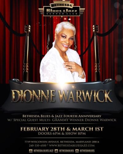 Dionne Warwick: Bethesda Blues & Jazz Fourth Anniversary Show will take place on Tuesday, February 28, 2017, and Wednesday, March 1, 2017, at 8PM (doors open at 6 PM) at the Bethesda Blues & Jazz Supper Club – 7719 Wisconsin Avenue, in Bethesda, MD. For tickets, call (240) 330-4500, or purchase them online.