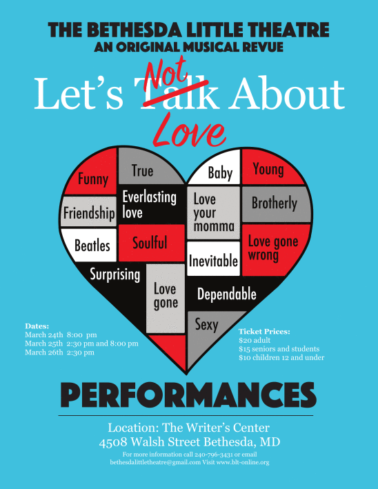 “Let’s not talk about love,” Cole Porter once implored, and who would disagree with the master? But the Bethesda Little Theatre (BLT) will be singing its heart out about love, the theme of its new musical revue, scheduled for four showings March 24-26th at the Bethesda Writer’s Center.