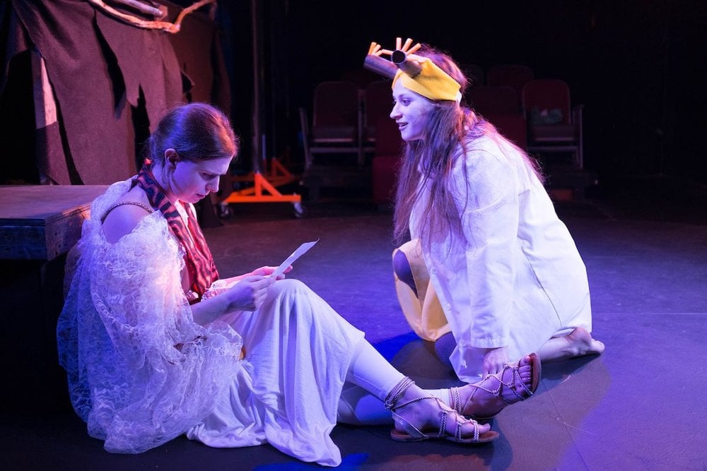 Barnett has chosen to use the structure of Greek drama to present her play. It opens, as do almost all Greek plays, with a female Chorus. The Chorus in this vehicle also takes on other roles, and costumes and disguises allow us to understand who these actors are now portraying. The chorus members play roles of both genders. One scene will have them as the witches and the next as the male astronomers. The actors also take on individual roles as well. They do this seamlessly and give strong performances throughout the production. Katie Jeffries Zelonka, for instance, does a wonderful seductive tango as a tigress. Amy Rhodes also plays Yia Yia, Aglaonike’s grandmother, and artfully conveys this caring and hardworking woman. Katie Hileman is the third member of the group and also brings us several wonderful characters along our road with Aglaonike.