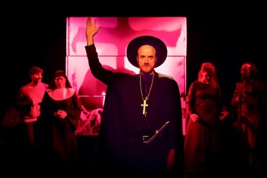 Subtitled “an opera without music,” Shand’s script is rife with poetic arias that fuse ecstasy, eroticism, and doctrine. And sometimes flat-out lechery, as when we meet the vain Grandier (Oscar Ceville) admiring himself in a mirror: