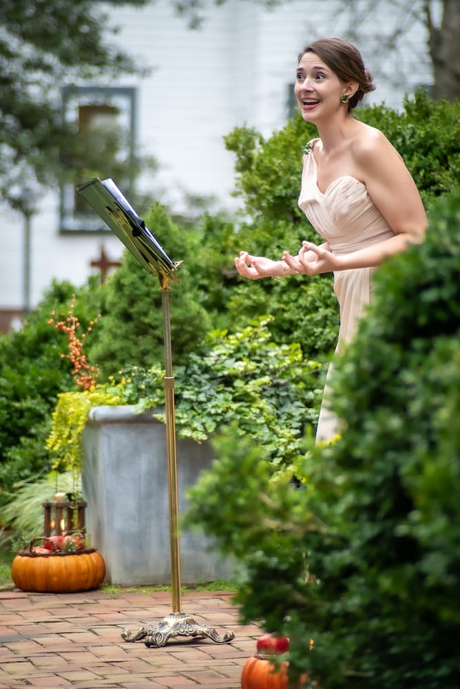 Elissa Edwards, despite having to compete with passing planes, helicopters, and even a lawnmower, has a powerful enough voice so that all audience members seated throughout the garden could clearly hear each word to every song. She gives every piece an emotional pull, starting with Purcell’s “Music for a While,” with its almost seductive hope that music will “all your cares beguile,” to the melancholy in “The Fatal Hour,” which mourns the need “when fate calls you from this place,” for “the thought does stab me to the heart.” She gives a celebration of being alone to “O Solitude,” which feels hauntingly moving, perhaps because we’ve been forced to spend so much time by ourselves the last six months. “O solitude, O how I solitude adore” reminds us of the power and joy that can come from being on our own.