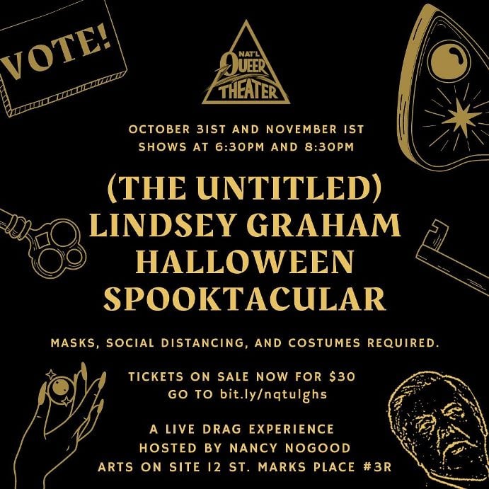 (The Untitled) Lindsey Graham Halloween Spooktacular – In National Queer Theater’s live Halloween show at Arts on Site (12 St. Marks Place, Studio 3F), host Nancy Nogood asks the burning question, “What do a drag queen in quarantine and a certain South Carolina senator have in common?” With her signature combination of drag and performance art, Nancy (@shesuptonogood) will let you know that they’re both “starved for the touch of a man!” as she scoffs at conventionalism and reveals her imaginings about the elusive politico behind the TV screen. Directed by Dmitri Barcomi, the “Spooktacular” plays October 31 and November 1, with a 6:30 pm and 8:30 pm performance each evening. A mask and a costume are required to attend; tickets are priced at $30. Seating is limited to fifteen audience members per performance, following pandemic protocol (and please be advised that the venue’s elevator is currently out of order, so you’re going to have to walk up, even if you’re wearing your highest stiletto heels). But if you can’t make it downtown or up the stairs, the show will also be livestreamed on the 31st, so you can still get the virtual Nogood scoop on the senator!