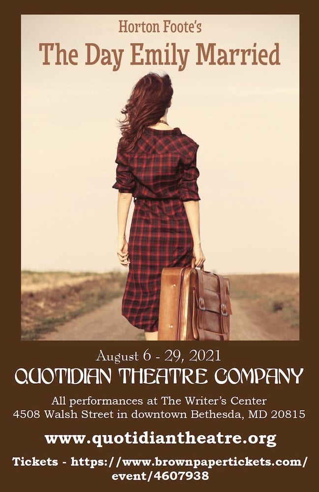The Day Emily Married by Horton Foote, presented bt Quotidian Theatre, plays August 6 through August 29, 2021, inside The Writer’s Center at 4508 Walsh Street, Bethesda, MD. To purchase tickets, click here.