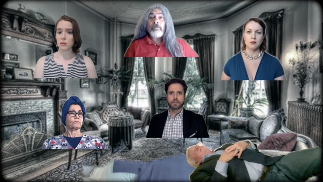 In choosing Tom Stoppard’s hilarious satire The Real Inspector Hound, Spooky Action Theater has found the perfect play to comment on the bizarre virtual spaces we’ve found ourselves in lately. Director Richard Henrich has assembled a solid cast that, with the aid of Videographer Tim Phillips and Video Editor Gordon Nimmo-Smith, flies about your screen, one minute fully present, the next minute a simulacra, adding (or is that subtracting?) yet another delicious dimension to an already bizarre play.