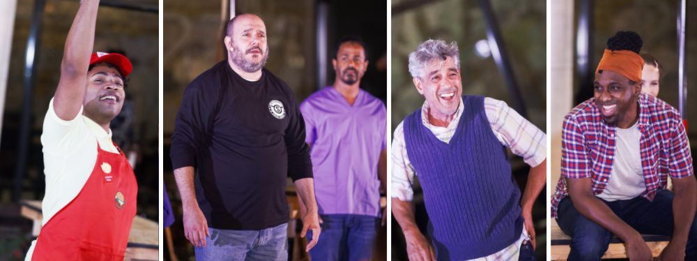 So it was that on a seasonably pleasant Labor Day evening I sat in one of four rows of folding chairs, stone benches, and stools stretching in front of a playing space some 70 feet wide and took in what looked to be a set improvised of under-construction scaffolding and strung with literal work lights. The Grotowskian “poor theater” esthetic might be said to apply here, but more aptly this design seemed driven by dedication to take-it-to-the streets activism.