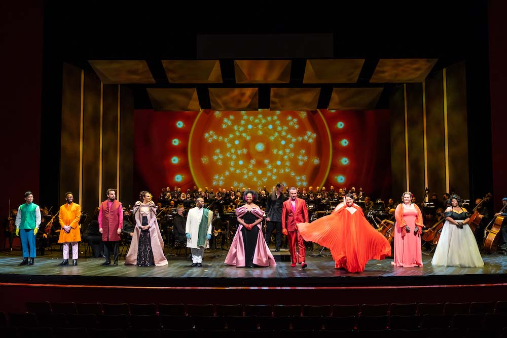The Kennedy Center Opera House opened Saturday night after more than 18 months with Come Home: A Celebration of Return. The full complement of the Washington National Opera orchestra was on stage and tuning. The fully vaccinated audience was dressed up and in the lobby or at the big pre-opera do’s, creating more than the usual decibel level of excited tittering. Overhead, the dazzling chandeliers, repeated for mirror effect in proscenium-wide projections upstage, beamed like galactic stars.