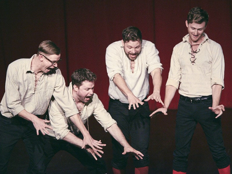 Ross Bryant, Joey Bland, Blaine Swen, and Greg Hess in The Improvised Shakespeare Company. Photo by Koury Angelo.